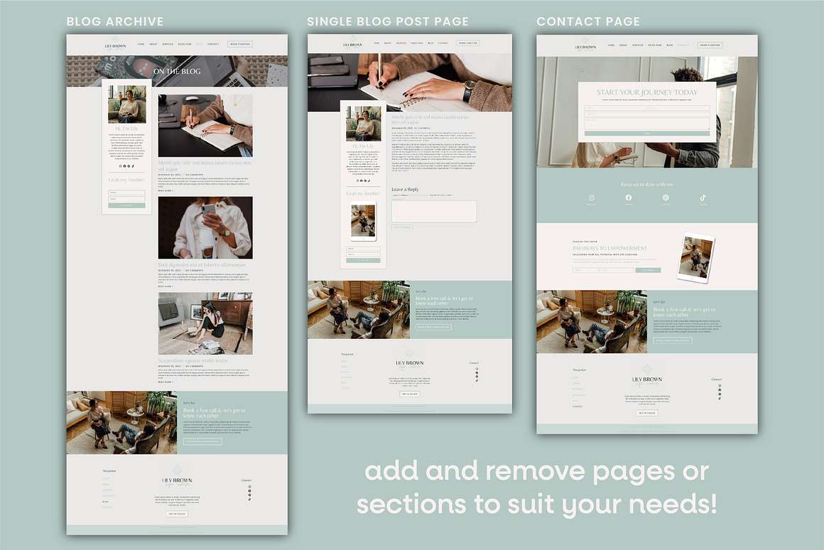 The Lily Brown Elementor Template Kit includes pre-designed pages for all the essentials, including: